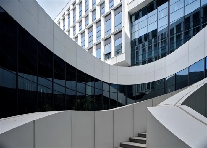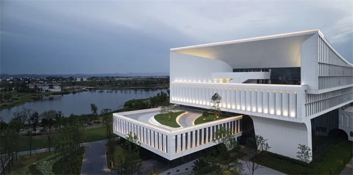 科创中心基地为三角形地块,南面紧邻泉水湖生态湿地,具有得天独厚的自然景观资源。为避免僵硬呆板、粗暴刚硬的空间处理,建筑师从自然汲取灵感,以轻松柔和、生态有机的姿态和环境握手。通过柔和的建筑形态,与生态湿地的自然语汇吻合,呼应了自然的湖面生态环境肌理,以开放共生的姿态融入周边环境,形成了自然与建筑相互环抱的空间意向。建筑有机地向基地的三个方向延伸,屋顶随建筑向周边延伸而升高,形成富有动感的展翼形态,好似一只即将振翅起飞的白鹭。柔和的建筑形态削减了工业化的建筑形态对生态景观造成破坏,犹如天然生长在湖边一般,用诗一般的东方意境与湿地环境温柔对话。