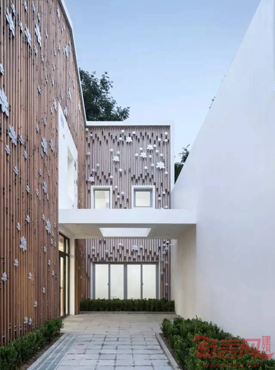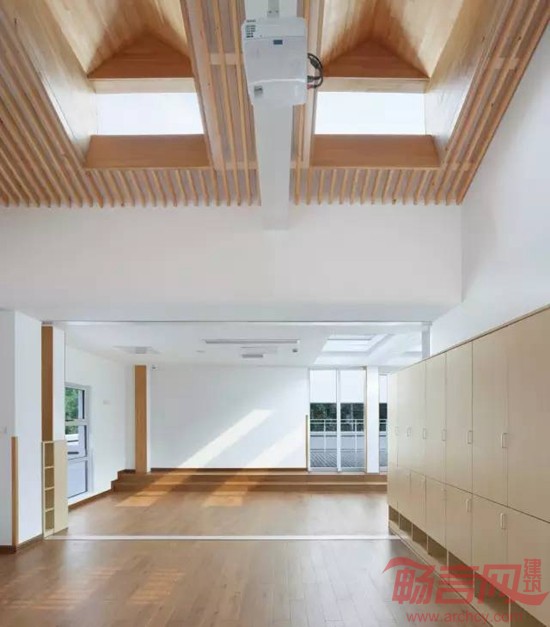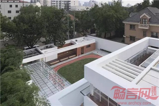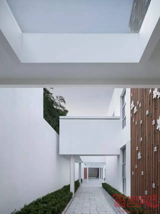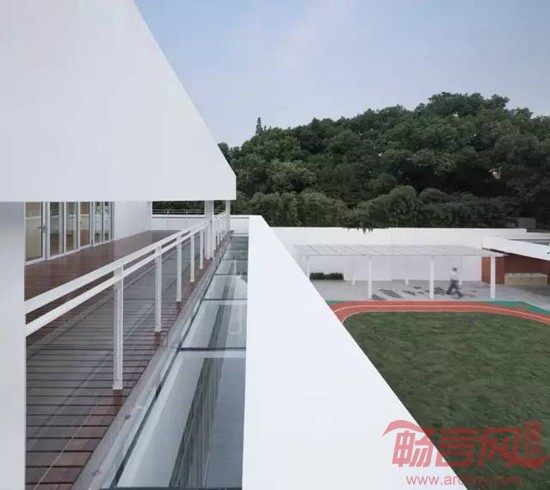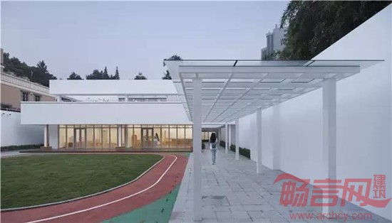 除了与桃江路可以对话的红色砖墙外,整体建筑运用了围合的白色墙带,这使得建筑完全从城市中消失。也尽可能让孩子们在闹市里得到一片大自然的安静,与阳光、自然形成对话。