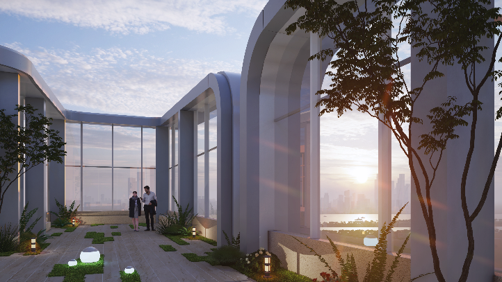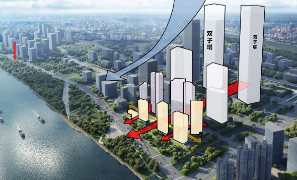 在整体立体空间结构的设计上,团队将以经二路城市活力轴、南侧滨江界面与东侧长沙涌景观带为核心的城市界面组团规划。在设计上呼应轴线,达到开阳透绿、面江纳景的通透开阔视觉,塑造对内对外的多元平衡,打造活力轴的门户感;空间上将滨江绿地渗透到建筑组团中,充分利用河涌、江面等景观资源,并通过设计手法打造错落有致的城市景观界面实现自然景观与都市交融的现代品质生活体验方式。