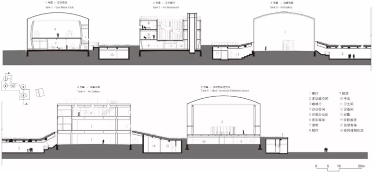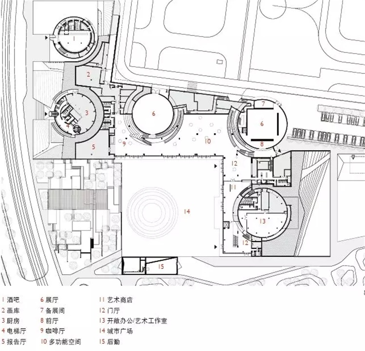 功能:艺术展览空间,活动空间,餐厅,咖啡厅,音乐表演空间,美术馆办公室及艺术品仓库等