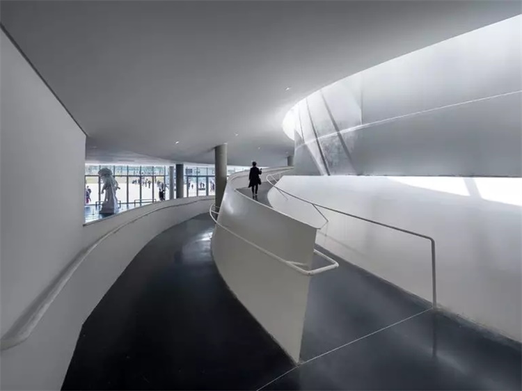 3号、4号、5号罐则被通过“超级表面”所覆盖的巨大的内部空间所连接。正如斯坦·艾伦所指出的,即便没有绿植或是类生物形态的形式语言,一个巨大的延展性空间同样暗示着自然的存在[1]290。“超级表面”之下的空间恰恰是这样的一种空间。这一从城市标高上来说隶属于地下室范畴的空间,通过面向主广场的玻璃幕墙和圆形天窗满足着自然采光的需求。作为结构支撑的混凝土圆柱并不完全均匀布置,而是不断协调着规则柱网和油罐的圆形平面之间的几何变化,甚至局部的某两根柱子构成了如树干般的“V”字状。3段分别环绕3个油罐的坡道形成了这个连续、流动空间中的停顿。在4号罐的周围,倾斜的白色钢栏板伴随着环形坡道的上升而不断地升高,如同环绕山峰的台地。随着坡道和护栏的抬升,天花也缓缓隆起,直至一圈漫射的天光将其和油罐表面分离开来。事实上,无论是坡道或是围绕油罐的天光设置,均来自对限制条件的巧妙利用。前者顺势借用着属于油罐一部分的阶梯状基础护坡,后者则来源于结构设计的要求。由于缺乏历史资料,结构师无法对既有油罐进行结构计算,所以新结构必须独立于老结构之外。