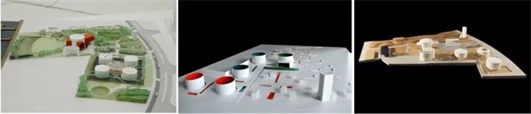 2014年年初,西岸片区的规划变得逐渐明晰。随着毗邻场地的西岸梦工厂的定位的明确,油罐片区的定位从表演艺术中心转向了视觉艺术中心。几经调整的场地边界直接影响着7个油罐是拆除或是保留的决定。在第二稿方案中,位于4个小型油罐组东北角的油罐被划出场地范围外而需拆除,3个大型油罐列中靠南的2个则被保留。在上一轮方案中,作为独立元素出现的梯形草坡在此演化为一片不规则的人造地表,主导着场地的组织布置。它从龙腾大道一侧起坡,以一个类似“Z”字形的形态,在不同的标高将三小两大5个油罐连接起来,并延伸至滨江一侧的项目空间。一系列巨大的长方形切口为“地表”之下的展览空间提供采光。这些切口仿佛回应着大地艺术家迈克尔·黑泽尔(Michael Heizer)的一系列对大地的切割作品。事实上,在设计过程中,当建筑师有意识地将单体式的建筑与广袤的地景融为一体时,20世纪60年代的大地艺术成为他们的灵感来源。在某种意义上,正如这稿方案的工作模型所概念化地呈现的,切割、抬起、弯折的操作使得方案成为一座城市尺度上的地形建筑(Landform)②。与先前的梯形草坡相比,这片被命名为“超级表面”的地形糅合了更为多样和复杂的功能与流线。作为一层表面,它同时考虑着地形的起伏、内部空间的需求和结构体系的布置,也引导着来访的市民们或是漫步于碧草茵茵的公园中,或是靠近感受作为工业遗存的油罐,或是漫步来到项目空间及滨水步道。作为一个空间体,它则连接起5个油罐,容纳着门厅、展厅、办公、服务等多种功能。