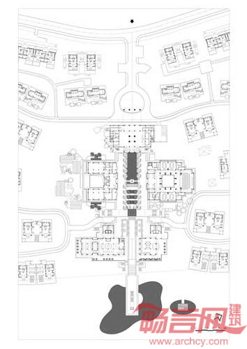 沿着主轴的两边布置了所有的公共服务设施,包括会议中心、水疗中心、餐厅等,不仅为公共元素形成了良好的空间组织,也创造出个性鲜明的独立小型建筑群,例如,水疗中心和会议中心的小庭院成为主轴线上大型公共开放区域的补充,同时,因其一眼望去并不显见,给人一种私密感和惊喜感。棕榈树列界定着主要空间,游客可以从树荫下进入各个设施。尽管所有设施在物理上都经由其下层的服务区域相连,但它们在上层都是独立分开的,就像“阴”与“阳”的概念,这也是建筑师设置的一个小小的空间游戏。