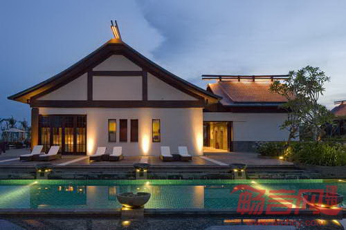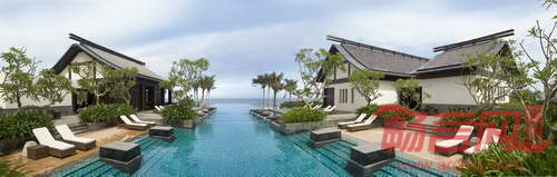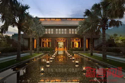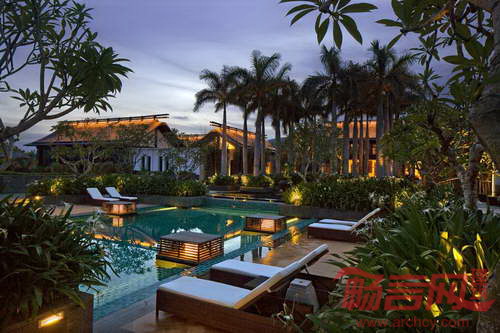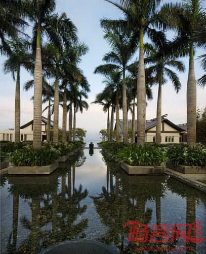 建筑师在场地上划出一条近150米长的水景中轴线,其中有一个88米长、8米宽(对应中国代表幸运的数字8)的水池,从接待区域直接延伸至沙滩,从水面望去,仿若与海天相连。酒店其他精彩的元素都围绕这个中轴线展开,同时也在感官上缩短了山与海之间的距离。