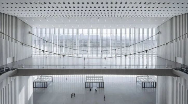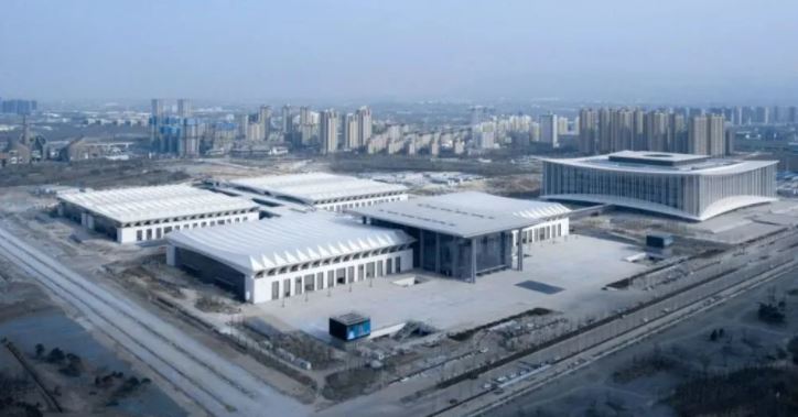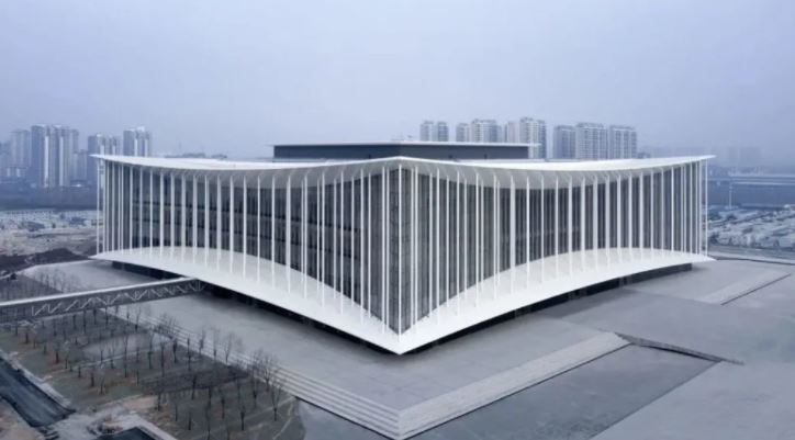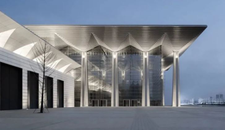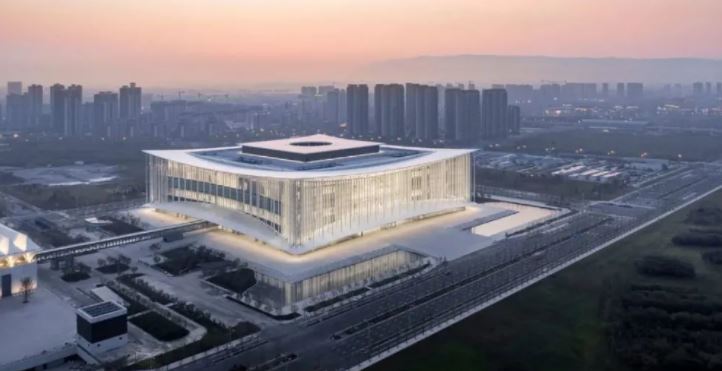 会展中心建筑群是陕西省贸易和产业发展的核心项目,起伏层叠的曲线屋顶以轻盈的丝巾为设计灵感,并结合由石质墙体构成的坚固基座。与流线型的展厅屋顶相对应的是大跨度出挑的登录厅屋顶,气势非凡,依照严谨的几何秩序而错叠的屋面,由高达30米的十字柱支撑。在二期工程中,展览中心建筑群将往北面扩展,沿着主轴线新增六个展厅单元,并补充一个大型的入口建筑,整体展厅规模将再翻一倍。