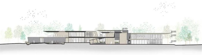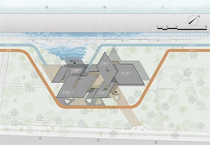 设计以简单的原型出发来塑造丰富的空间关系:一方面我们参考了儿童折纸形态,将5个C型单元的“纸片”嵌套形成基础构型,另一方面翻折的屋檐宛如轻盈的风鸢轻展翅膀,悬停于钱塘江畔。