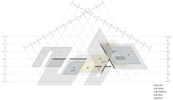5个C型构架分别有着不同的朝向,面向江面的3片作为滨江书屋和步行者的能量补给站,静对流动不息的江面。面向城市面的2片,结合安澜工程抬标要求所带来的近2米高差变化,形成室内亲子咖啡厅和室外攀爬、滑梯、沙坑等儿童嬉戏场所,“纸鸢竹马伴儿嬉”,大片屋檐的荫蔽为妈妈们提供了休憩空间。