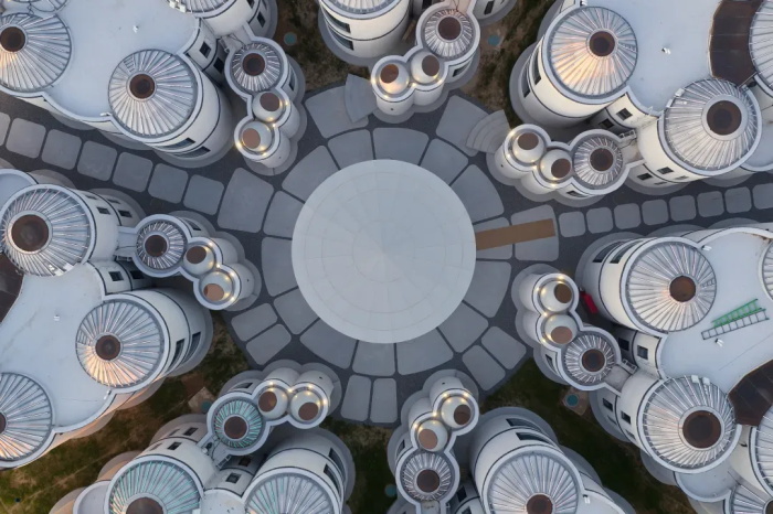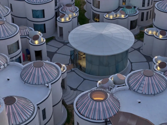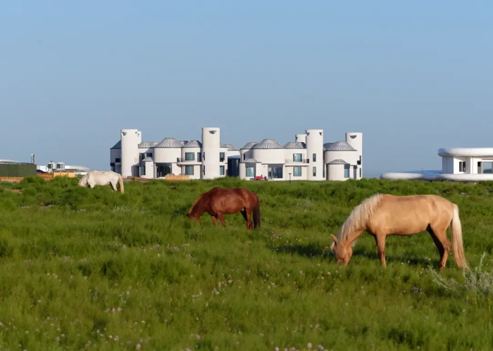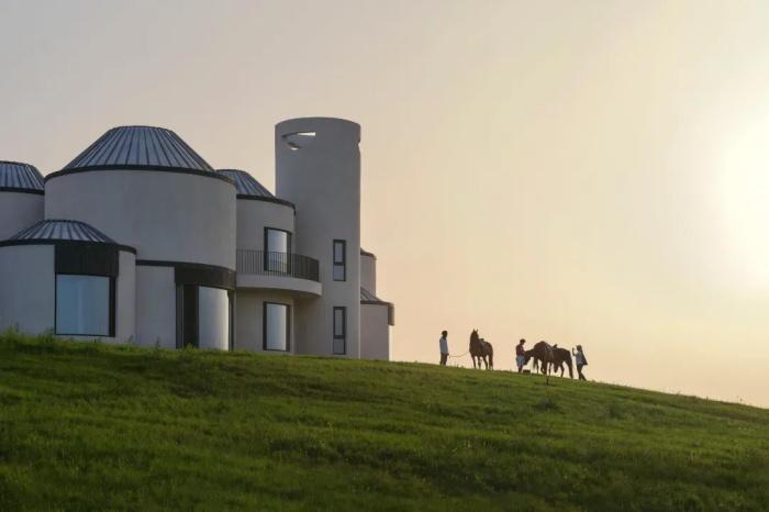 建筑师从蒙古包形象中提取圆柱+圆台形建筑体量,加以变形,成为独特的、大小不一的建筑单元,由此聚合而成为一个独特的院落。整体聚落由7个基本居住单元组成,每个单元的面积约305平方米。单个居住单元内包含了完整的客厅、厨房、起居室、茶室、4个卧室和一个瞭望塔。合理计算的人居尺度计算每个圆形空间的尺寸,同时通过相连接的通道形成有趣的室内空间氛围。在靠近草原的空间,落地玻璃窗提供了大面积的草原景观视野。