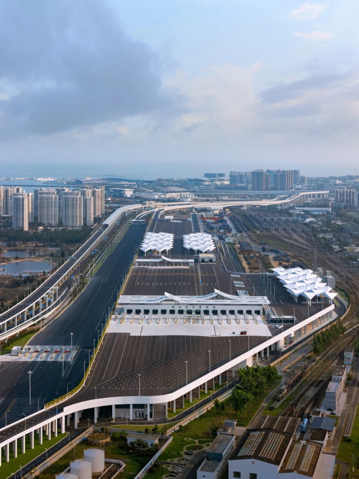 设计深度回应热带海岛气候特征,将遮阴避雨功能与在地文化转译融合:首层延续海口骑楼街廊的空间风格,通过连续拱廊形成光影交织的物流通道;二层轻盈的膜结构顶棚以海口市花三角梅形态为原型,纯白曲面既遮蔽烈日暴雨,又以海浪般的柔美曲线重塑口岸建筑表情。