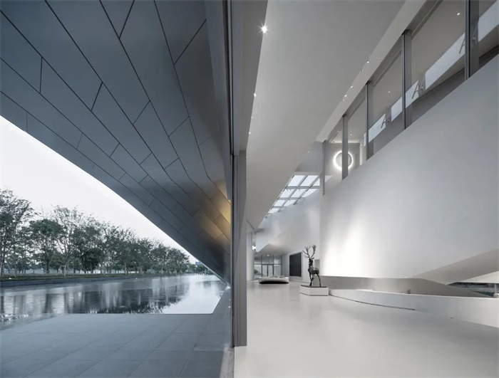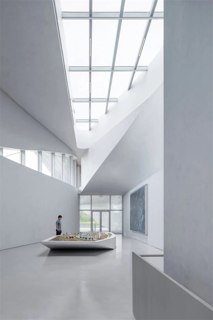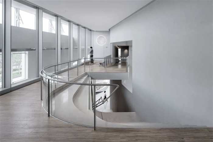 整个建筑一气呵成,建筑表皮与内部的展示空间成为一体,漫步在其通透的空间中,像是流连在环秀山庄著名的湖石假山中。内部的弧面墙体为北侧来的自然光提供了优质的光线载体。建筑形式节制且别致(共仅四处扭转),却产生了非常丰富的空间体验。