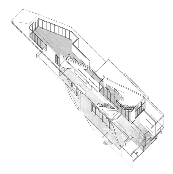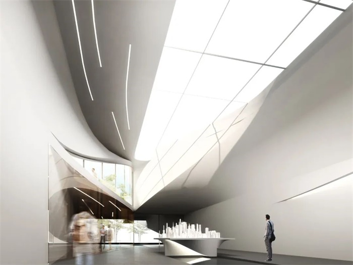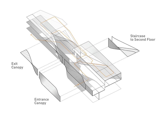 方案的概念源自于一系列翻转的折墙,由西向东缓缓打开并90度扭转,其舒展的部分容纳人的行为,而翻折的空间用作展示与墙体。翻与折的过程,梳理出一系列丰富的空间形态。