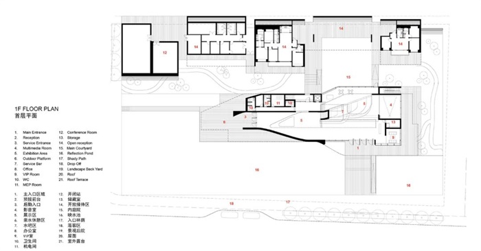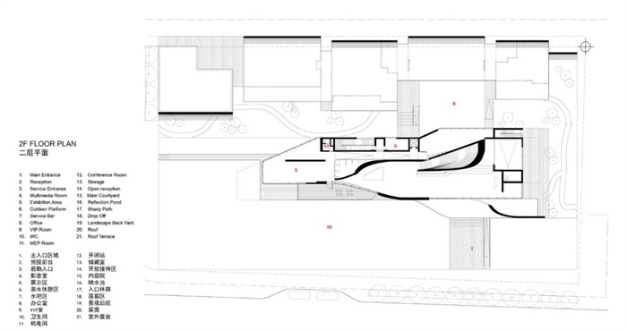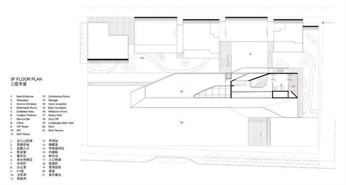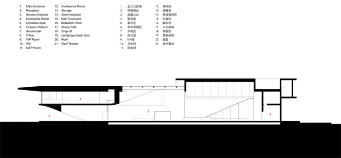 景观庭院位于艺术中心北侧,景物一体的“枯山水”景观将为访客带来有品质的空间享受。游客可以通过中心楼梯来到位于二楼的书房,然后,向东穿过一条洒满阳光的廊桥来到整个建筑最东侧的“船头”部位,眼前徐徐展开的是秦淮河对岸的城市风景。