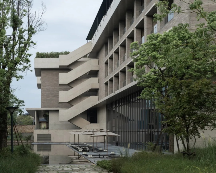 息壤酒店选址于一处连排的鱼塘,东侧是烟波浩渺的太湖,北侧紧邻沙塘港河,南侧依傍竺山,西侧与社区市集相接。面对这个具体且多样的环境肌理,我们尝试寻求一种适宜的空间机制,向外回应四个方向,向内组织空间,以唤起蕴含当地风土精神的空间经验。