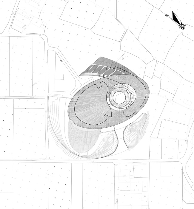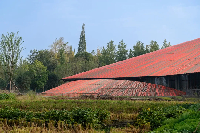 项目从自北向南逐渐抬升的田地为出发点,以一个豆瓣般的椭圆曲面作为屋面主体,北侧一片小屋面从场地上升至展厅屋顶,南侧的小屋面嵌入下沉庭院。三片屋面与地形的变化相呼应,相互交叠,尽显川西屋顶的轻盈自由。