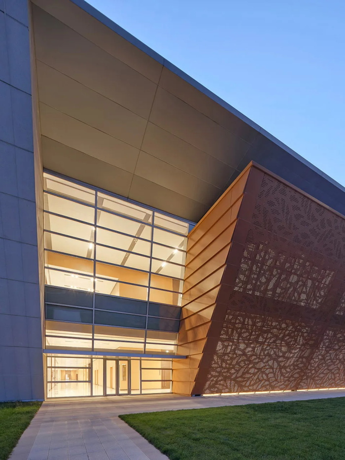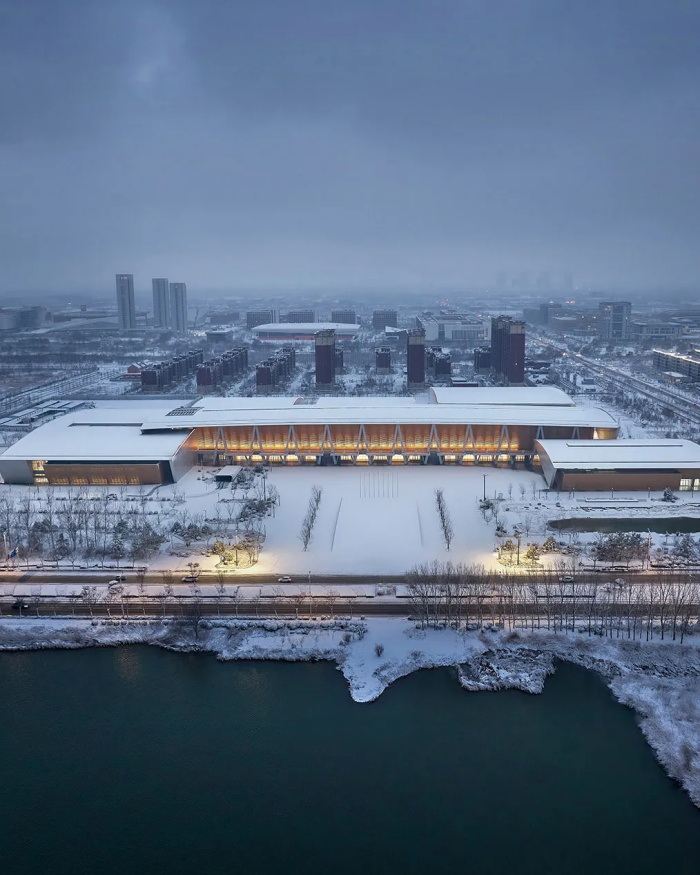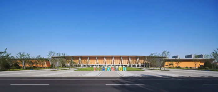 设计借鉴剪纸和编织的民间工艺,通过造型塑造和肌理处理唤起黄河文化的意向。东立面面向主广场,采用大面积的金黄色编织肌理,形成富有韵律的整体形象,在不同的阳光照射和角度下呈现出多变的建筑形象。