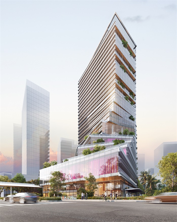 设计伊始,可持续性便是 NBBJ 设计中不可或缺的一部分。通过一系列的现场研究和分析,该建筑的朝向既能最大限度地利用河景和自然采光,又能保证空间私密性和灵活性。除此之外,主要的可持续策略还包括高性能幕墙、高效空调系统、现场雨水收集、降噪减震、中水和废水再利用、高效洁具、节能照明系统、改善室内空气质量等等。其中,建筑的高性能幕墙不论是从外观层面,还是节能层面都是项目的关键特色。