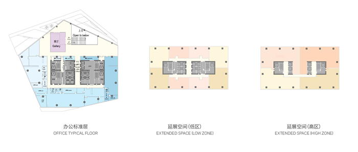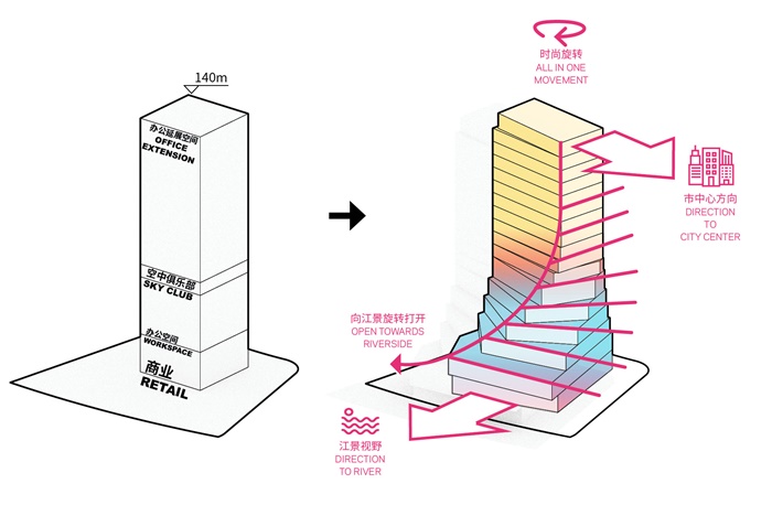 设计旨在打造一个多功能社区,将时尚办公、展览空间、便利零售和高端配套等功能组件整合在一起。在功能组织方式上,将办公延展空间抬升到时尚及办公元素之上,以此传达“将生活置于艺术之巅”的设计想法。