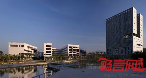 根据校园建筑上下课瞬间人流大的特点,设计上采用二层步行系统从空中分解人流压力。同时,校园内设置了大量的架空层,有效遮挡了南方炎热的阳光,为师生提供了充足的非正式交流与活动场所。15层的办公楼在垂直方向上设计了多处空中花园。