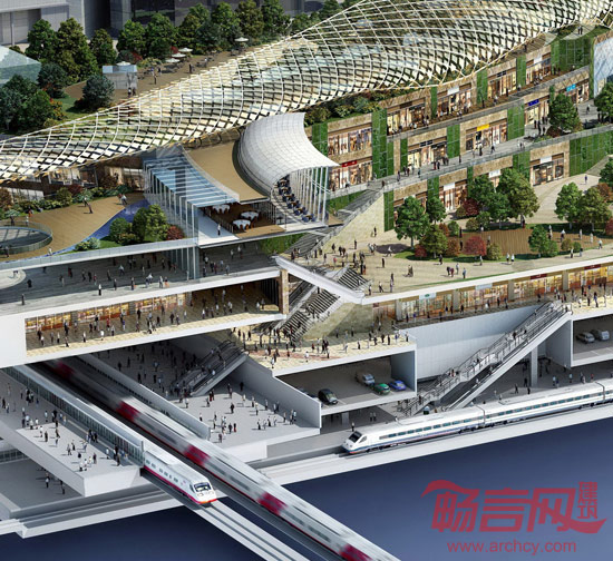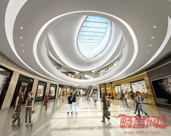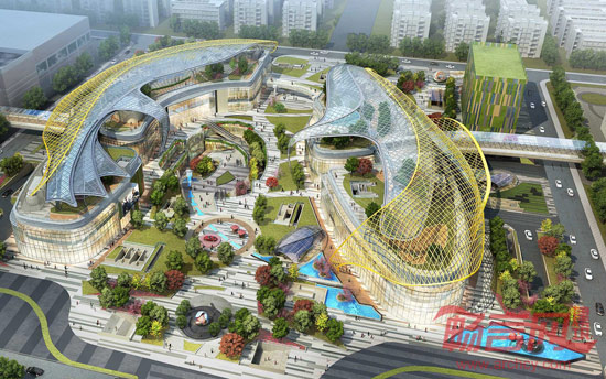 是次项目与英国贝诺建筑公司合作,设计概念来自中国传统两条正在游动的鲤鱼姿态,营造出流通性高及四通八达的空间感,而在零售商店旁边及中心位置则形成花园空间。商店设於最上面两层及地牢两层,而地牢最低层为停车场。