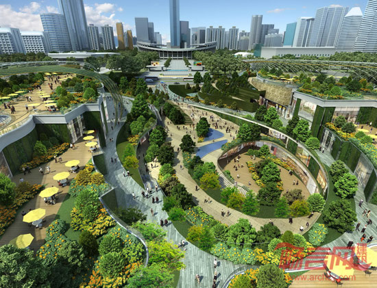 在户外区域的设计上,团队以全天侯可使用为目标,利用ETFE薄膜作为屋项物料,并建有一条有盖行人通道,直达购物中心。低于地面的花园境观设计中,用上柔和的绿化墙及布满植物的小径,遍及公园每个角落。购物中心公园还设置了雨水收集系统和节能低幅射玻璃幕墙,以提高建筑物的对环保成效。