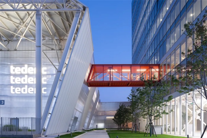 这一理念贯穿于建筑形态的设计中,泰瑞总部通过红桥与智能工厂相连,象征着持续的能量供给。工厂的造型与光影效果如同一颗电池,驱动制造系统的永续运转。以工业为主体的经济开发区使该区在夜晚显得昏暗与不安。设计同时以“城市之灯”为关怀出发点,在夜晚展现出温暖的光线,使工厂成为该区夜景中的璀璨光点,点亮工人们的回家路。