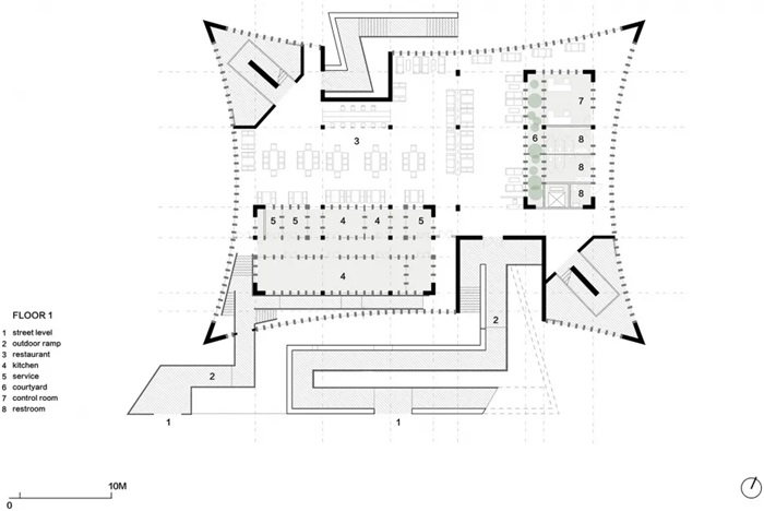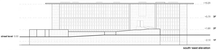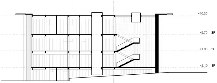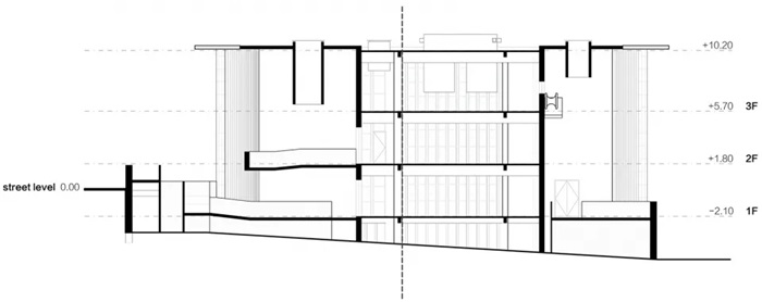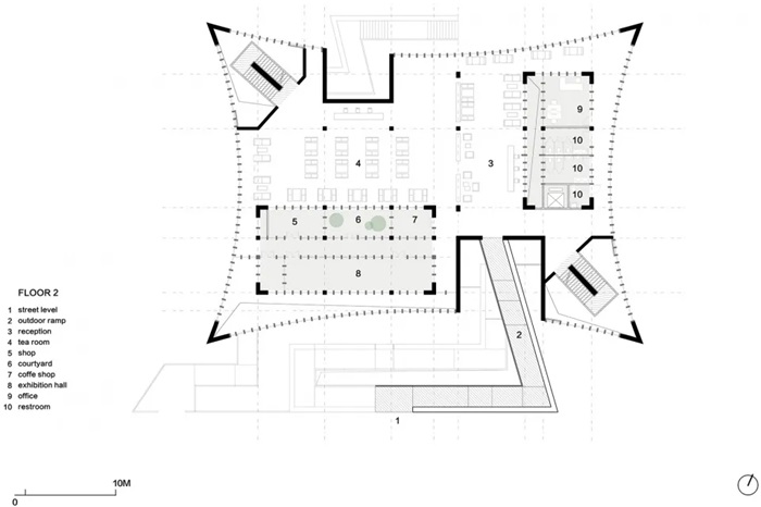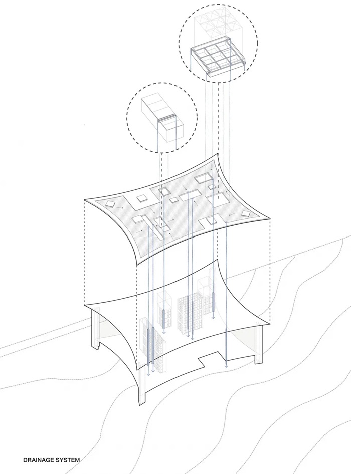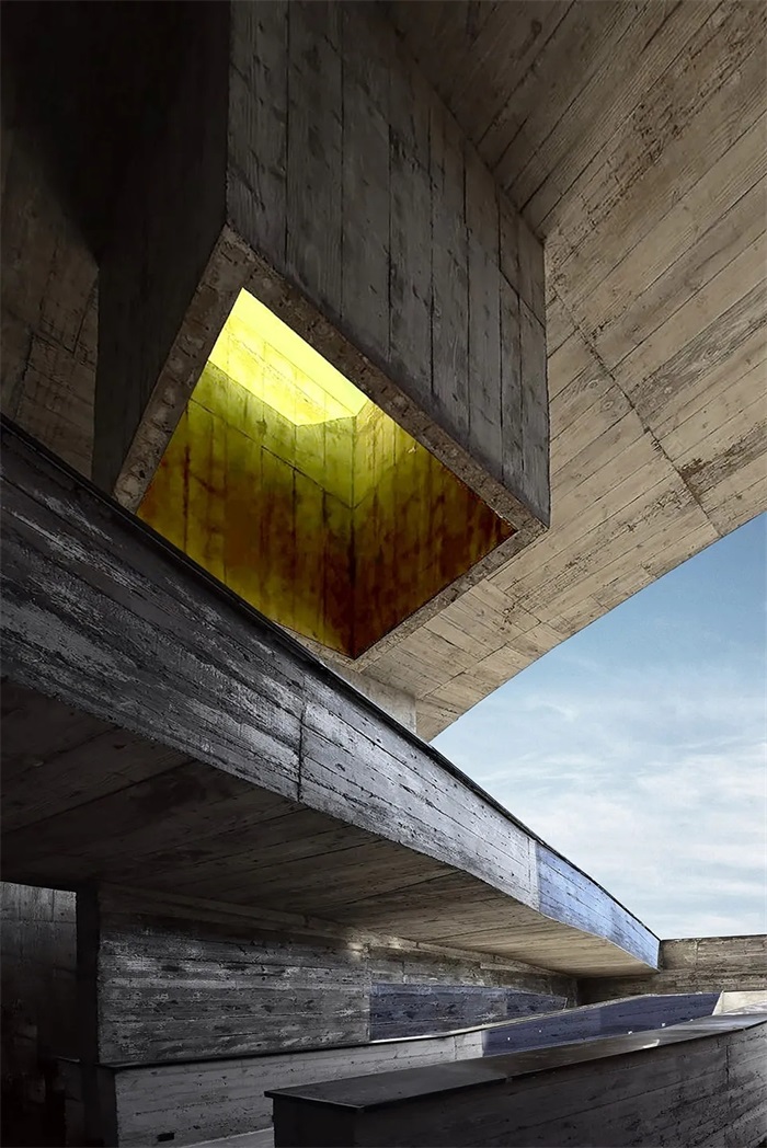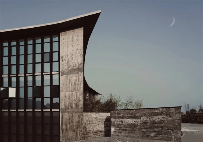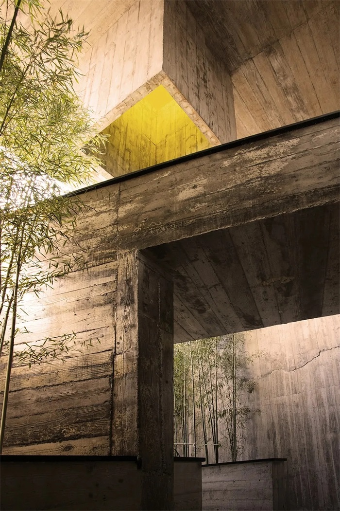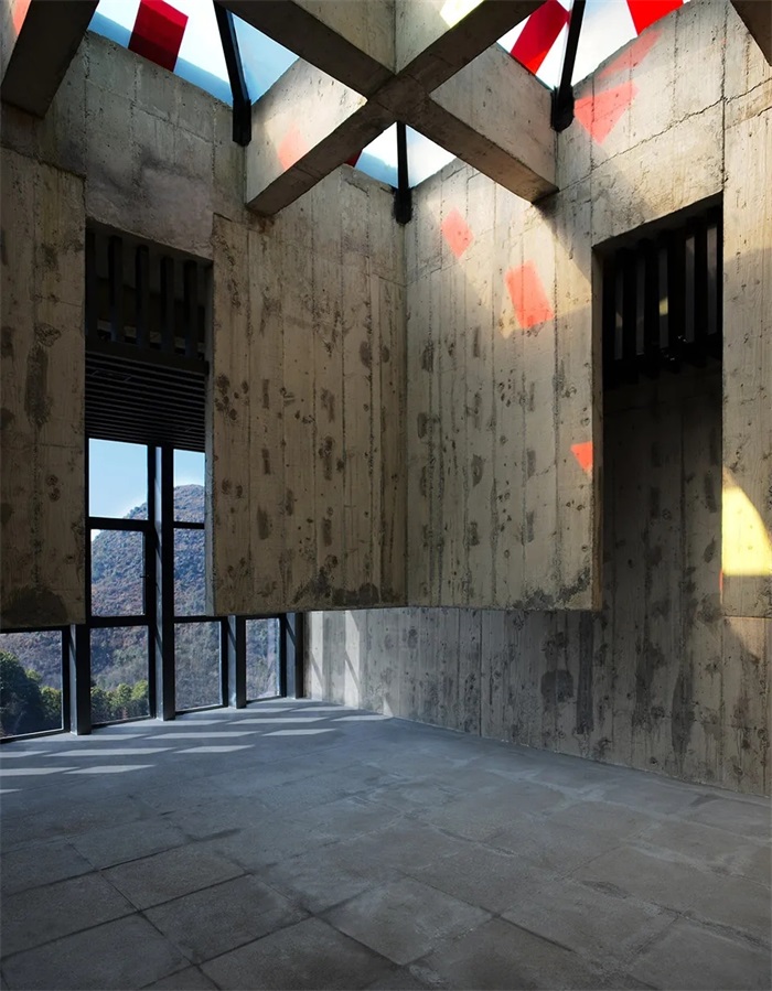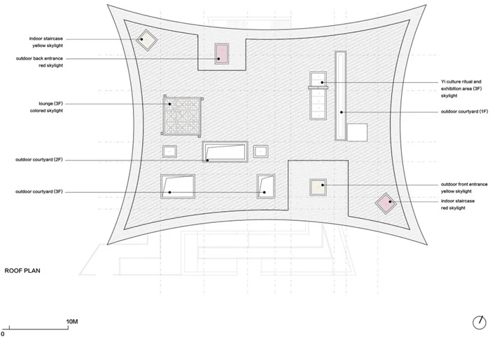 首先,在旷野中植入一孤寂纯净的建筑体量,恍如一方老彝族祀坛;进而在其上覆以四边凹弧形的出挑屋面,试图回应来自周围山野的张力,这组独特的屋面天光/雨水收集系统达成了建筑与天地的互语,屋面雨水经有序的天沟排水系统,贯穿露天院落群,融入大地——润物细无声;同时这些院落群亦有效地处理了内部空间深处的采光与通风;与此同步,室外入口处那组折叠起伏的坡道与弥漫着仪式光芒的狭长的垂吊天井的组合,令人联想起“火把节”中在山道中盘旋行走的赶“火”队伍。