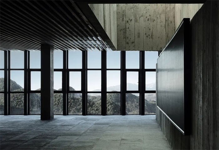 材料:彝族老木屋回收木模板/当地松木木板混凝土体系、黑色金属、中空玻璃