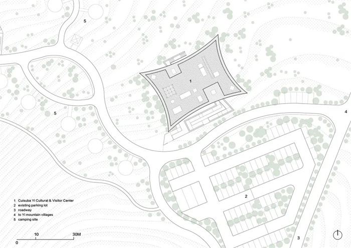 崔苏坝彝文化游客中心挺立在中国贵州西北部海拔近2000米的山地高原之上,一片被群山环绕的高原草甸间;建筑从一片近20度的斜坡中拔地而出,直面空旷的草原与群山。该中心的设立意在助力当地旅游业,同时试图再生与发展当地世居少数民族——彝族的建构文脉。