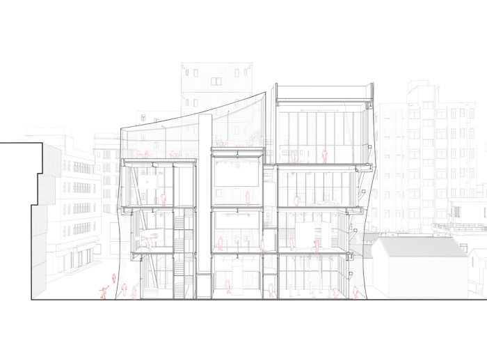 设计在表皮与体量之间创造了可以从地面一直走上屋顶的垂直漫游路径,缠绕建筑而上的竖向动线将公共领域渗透至建筑的周圈乃至屋顶,将不同层的展厅、屋顶平台联为一体,提供了在不同高度和视角观看城中村独特城市景观的机会,而当从城市看向建筑,在朦胧表皮后漫步移动的人影,又赋予建筑一种活跃、动态的属性。