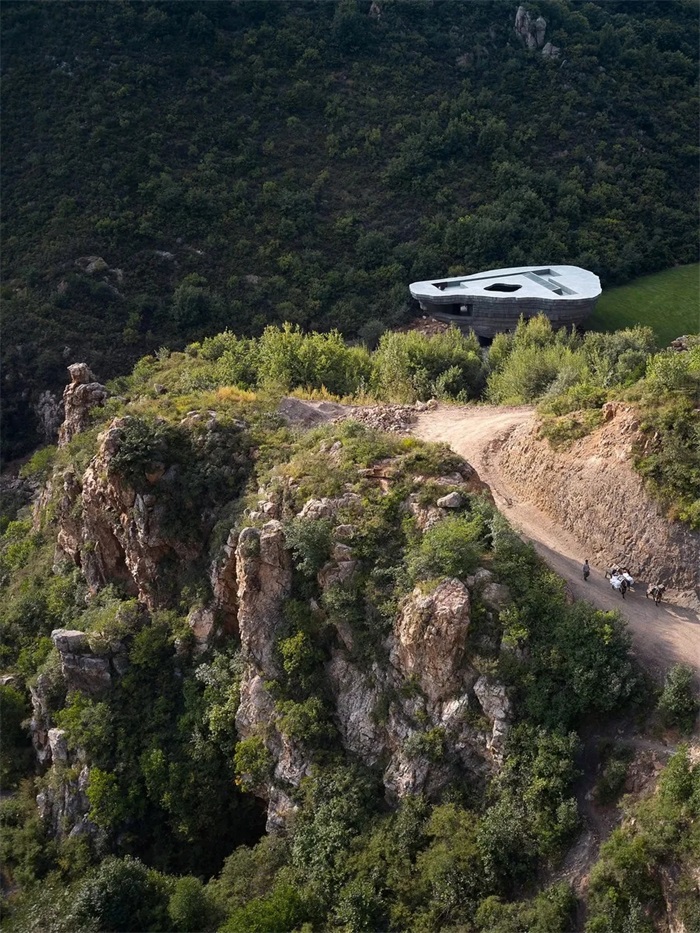 位于距北京市区约两小时车程的河北承德金山岭,建筑如同一块来自远古的巨石,降落在可以远眺长城的山谷。