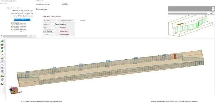 以往的项目中,作为结构深化顾问的外方团队会派技术人员进行现场指导,但在主展馆的施工中,由于疫情等影响因素,外方团队无法亲临现场。因此在木棚架深化设计阶段,从木构件运输,到现场厂房预拼装,再到现场吊装拼接的整体过程,均通过Rhino进行全面建模模拟,并通过动画演示的方式与现场团队沟通,确定方案的可行性。更重要的是通过工程管理软件Procore搭建全新的线上模型图纸混合工程管理系统,将加工图的每个细节分层级进行连接整合,形成文件存储在现场施工管理终端中,现场技术负责人可随时查看比对,及时反馈问题和加工情况,方便进行下一步的技术指导。