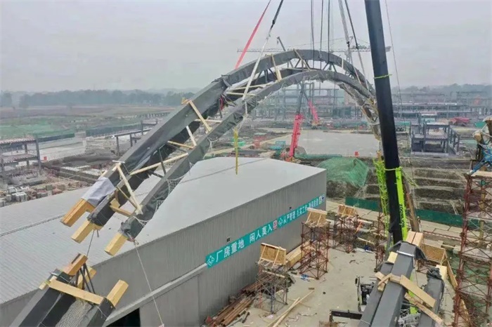 施工时需要在现场搭建临时加工厂房进行精细的小段拼装,在小段构件出厂后,在相应的桁架位置附近,将3~4个小段构件拼接为中段构件。每一榀桁架的整体吊装作业,则是由大型履带将3或5段中段构件吊在空中拼接为整体。在整体形体逻辑相同的前提下,每榀桁架形态均有差异,每一个环节的微小误差都会导致拼装不能顺利进行。