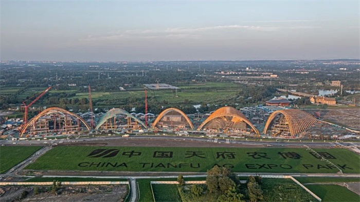 木结构建筑在我国有着悠久的发展史,并且在发展的过程中形成了一套“数字化”建造的逻辑体系。从宋代的材分制,到清代的斗口制,模数制度成为古代木结构建造的核心方法,通过这种数字化的设计建造,采用简单构件即可组合成复杂的结构体系。在当今绿色低碳的设计趋势下,木材作为一种可再生的碳汇材料,被越来越多地运用到建造实践之中。相较于传统以实木为主要材料的建造体系,胶合木结构更适合现代工业加工体系且符合环保固碳要求,已成为现代建筑的主要探索方向。其主要建造方式为预制拼装,具有可变且离散的加工与建造特征,以“文件到工厂”的工作流程,将设计结果通过特定的数据形式,直接从建模软件传递到数控机床或建造机器人上,实现设计、加工和建造的无缝衔接。利用这种三维数控加工技术,能够大幅度提高木材加工精度,并且可将木材加工成复杂的三维形态构件。这为天府农业博览园主展馆(以下简称“主展馆”)的大尺度非标准构件胶合木结构建造提供了技术手段。