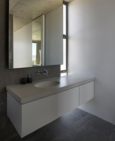 编辑点评:设计师选择花岗岩瓷砖的纹理来打造恢宏的浴室空间,向外伸展的露台与远处的岩石产生共鸣。浴室空间明亮宽阔,各种现代经典的浴室用品规规矩矩摆放着,尽享源自大海的洗礼。