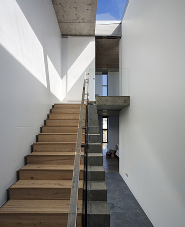 编辑点评:设计师把楼梯设置在了墙体的边缘,这样既节省了空间又不会影响到整体的通透度。原木色的踏板和透明玻璃的扶手一起提升楼梯空间的质感,上空的镂空设计增加楼梯的采光,立显时尚个性。