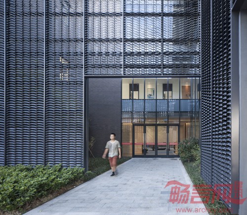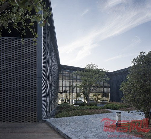 通过透空的砖墙和自主研发的“离瓦”(瓦型百叶)的运用,模糊边界营造了江南园林的空间氛围