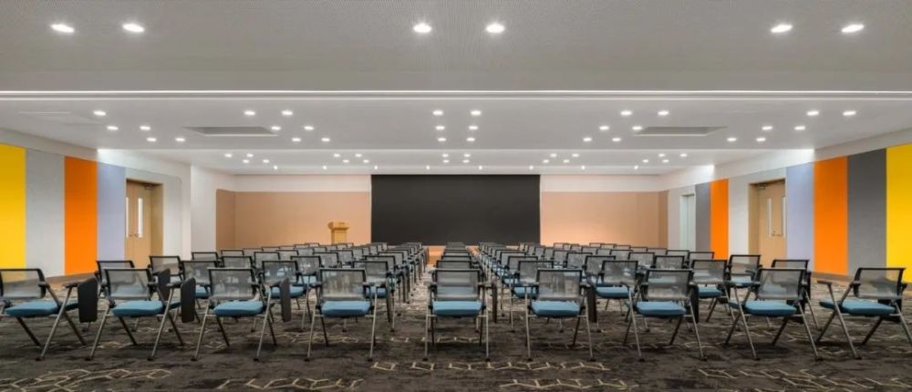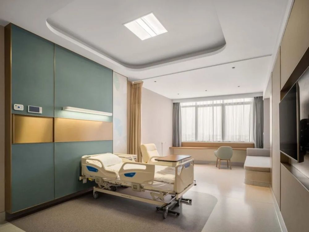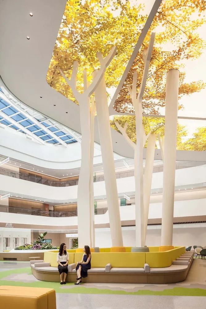 大堂内定制的暖色调布艺以及银杏叶图案的墙面,烘托出亲切温馨的氛围感。嘉兴作为著名的旅游胜地,吸引着众人在秋日里来此观赏金色的银杏叶。银杏树象征着力量、希望和韧性,这些特质也被设计师提炼为抽象的设计语言,运用在医院室内设计中。