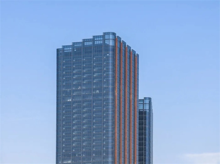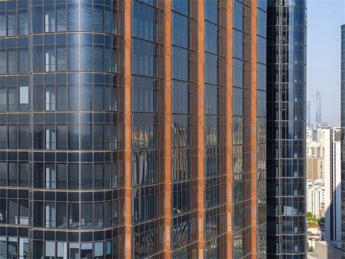 塔楼的造型集性能和美观为一体,SOM的设计从中国传统的唐装以及毗邻的真如寺建筑中汲取灵感——塔楼的玻璃幕墙与彩釉细部造型形成鲜明的对比,宛如唐装简约的外观与其华丽、精致的内衬一般;我们的设计在塔楼立面波纹状的竖向肌理形成的凹槽处打造了一系列可开启窗,为室内空间带来新鲜空气。凹槽采用定制的青铜色陶瓷纹样的玻璃,与真如寺的青铜转经筒相呼应。