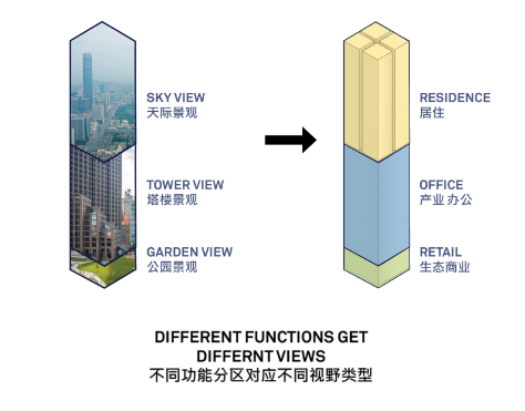 M0产业用地性质的超高层综合体,为各种不同复杂业态的融合和空间营造带来全新的课题和挑战。项目包含创新产业用房,自持办公、居住、及商业等多种业态。设计充分考虑到周边建筑日照需求及建筑各业态的视野景观,将裙房设置于临近公园的东侧,塔楼则置于靠近路口的西侧,其中商业功能置于低区,将与东侧的城市公园联为一体。产业用房及办公置于中区,提供高效的城市连通效率,连接都市车水马龙;公寓置于高区,东西南北朝向均可欣赏城市美景,并为城市产业及使用者提供非凡的工作及生活体验。