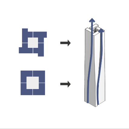 在这片丰富城市滋养的地块上,自然要素的汇聚是我们设计的灵感和主线。各种元素的汇聚上升使建筑平面完成从正方形到风车形式的过渡,寓意着流动与平衡;同时自下而上,巧妙而精确在垂直方向上的解决了商业,办公,空中公共空间和居所等复杂的功能需求。设计将塔楼上部一分为四,犹如流转的风轮及流水,并结合深圳盛行的东南季风特点,通过体块的推挤拉伸,错落间形成西、南高且东、北低的优美形态,以流线形态呼应风的来势。上方的风轮平面与下方规整的体块通过流动顺滑的曲线自然衔接,灵动优雅,形成极具动感且富有东方美学的建筑轮廓。