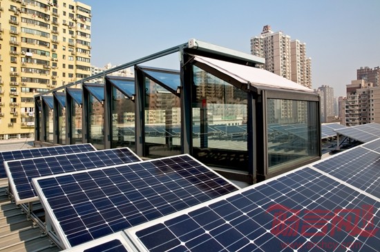 即发即用的非逆流并网型太阳能光伏发电系统:项目采用了1台变压器容量为500kVA,光伏系统采用非逆流并网光伏发电系统,系统总装机功率约12.87KWp,太阳电池组件(单晶硅)面积约84.26m2。太阳电池组件安装在申都大厦屋面层顶部,铝质直立锁边屋面之上.