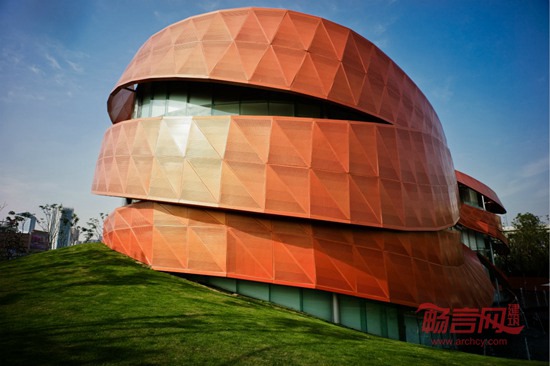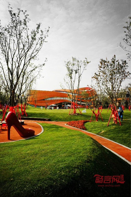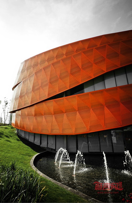 绿地成都航校展示中心售楼处成功吸取了成都地域的丰富性和多样性,探求建筑自身逻辑与艺术。展示中心红色飘带的构思,充满了活力,代表一种未来及时尚感。伊东丰雄曾经提出,建筑发展到今天,不再是永恒的象征,它也可以是快速的时尚的,像其他时尚产品一样,而建筑的表皮正是这种时尚的临时性演绎。兼具标杆性、昭示性、时尚感和超现代潮流,绿地成都航校售楼处经历了无数的方案海选,被否定,再创作,终于成为使各方都满意的成果。