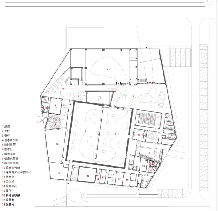 行至长墙尽头,自然而然地顺其左拐,博物馆入口便现于眼前。灰色石砖铺地引导着人们穿过一个敞开的庭院,进入到建筑之中。如果说尺度的影响使得聚落的感觉并未于外部呈现,那么进入到主入口门厅后,材料和内院的处理使得“建筑是由一系列小屋组成”这一感知变得清晰。陶赭色清水混凝土墙体的做法被延伸至室内,似乎人们此时依然身处建筑之间而非建筑之中。穿插于墙体之间的白色天花吊顶和内院进一步强调着一种建筑与建筑间的空隙感。白色天花吊顶特意与两侧墙体保持了一定距离,并通过灯光设计对这两道缝隙加以强调。这种做法通过白色天花吊顶的连续性,来烘托由陶赭色墙体围合而成的不同单体的体块感。与白色天花吊顶和陶赭色墙面相比,并不那么鲜明,却同样暗示着外部的连续性的则是铺地的做法。入口庭院的灰色石砖铺地直接延展至室内,几乎覆盖了所有的公共区域,从而构成了一个从外部到内部的连续界面。在坚硬的灰色地面之中,几处由木质地板铺地构成的多边形区域和安放其中的多边形木质家具犹如岛屿一般存在。这些由建筑师精心设计的家具布置和材料处理方式,似乎暗示着这样一种状态:尽管身处屋面之下,但这里仍如外部世界一般,而唯有木质家具和铺地区域才构成了停留小憩、如“原始棚屋”般的庇护之所。由此,似乎也不难理解为何这些木质区域采用了与建筑几何单体类似的多边形形态。在某种程度上,它们正如一个微型聚落一般,构成了博物馆公共区域的活力中心。值得指出的是,室内墙体虽然延续了陶赭色清水混凝土的做法,但却采用了更为细腻的木纹模板,并将这种肌理保留于混凝土表面,从而在参观者的身体尺度上刻画出更为丰富的细节。