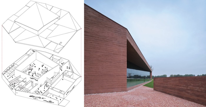 更进一步地,在处理几何单体的形式语言与组合关系时,建筑师有意识地避免了像似符号的出现,而以一种更具当代性的方式对聚落的形象进行诠释。如果说提及“原始小屋”,人们往往会联想到对称的双坡屋顶,那么建筑师在此则通过更为复杂的折面屋顶的做法,既唤起关于“小屋”的联想,也赋予了它们一种当代意味。不同单体的组合以一种看似无序的方式进行,从而有意地避免了对称轴线和正立面的出现。从某个角度来说,这种组合方式恰恰与考古研究中的缀合法有着相似之处:根据不同“碎片”之间的形似和功能关系将其组合起来,重新构成一个完整的“物件”。考古研究往往使用白色陶泥来补全缺失的碎片,而在马家浜文化博物馆中,缺失的部分自然而然地成了“留白”的内院。