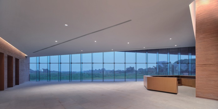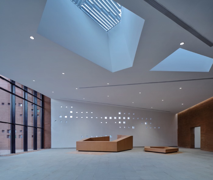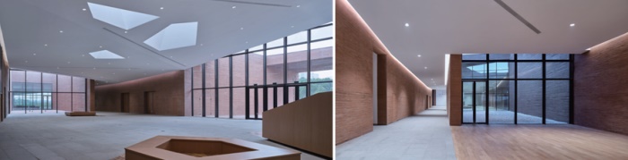 如果说聚落的构建源自概念层面的意图,那么当人们身处马家浜文化博物馆之中时,聚落的感知更多地来自建筑师对材料和光线等细节的考虑。或许在室内很难精确感受到不同几何单体与整体之间的缀合关系,但是粗粝的陶赭色清水混凝土墙体和光洁的白色天花吊顶之间的对比、勾连内外的灰色铺地、点缀其中的内院,却足以向空间的使用者直观地传递出一种关于聚落的感知。不同的展厅和功能房间组成了形成聚落的小屋,而它们之间的公共空间则通过从封闭到开放的序列,建立起了一种从当下城市到远古遗址之间的衔接和过渡。