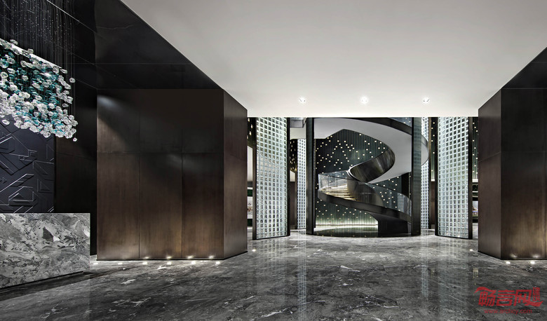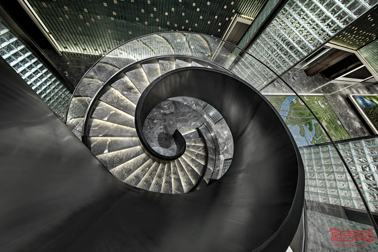 核心区以巨大的旋转景观楼梯统领视觉焦点,盘旋出一个充满内聚力的环形探索空间。