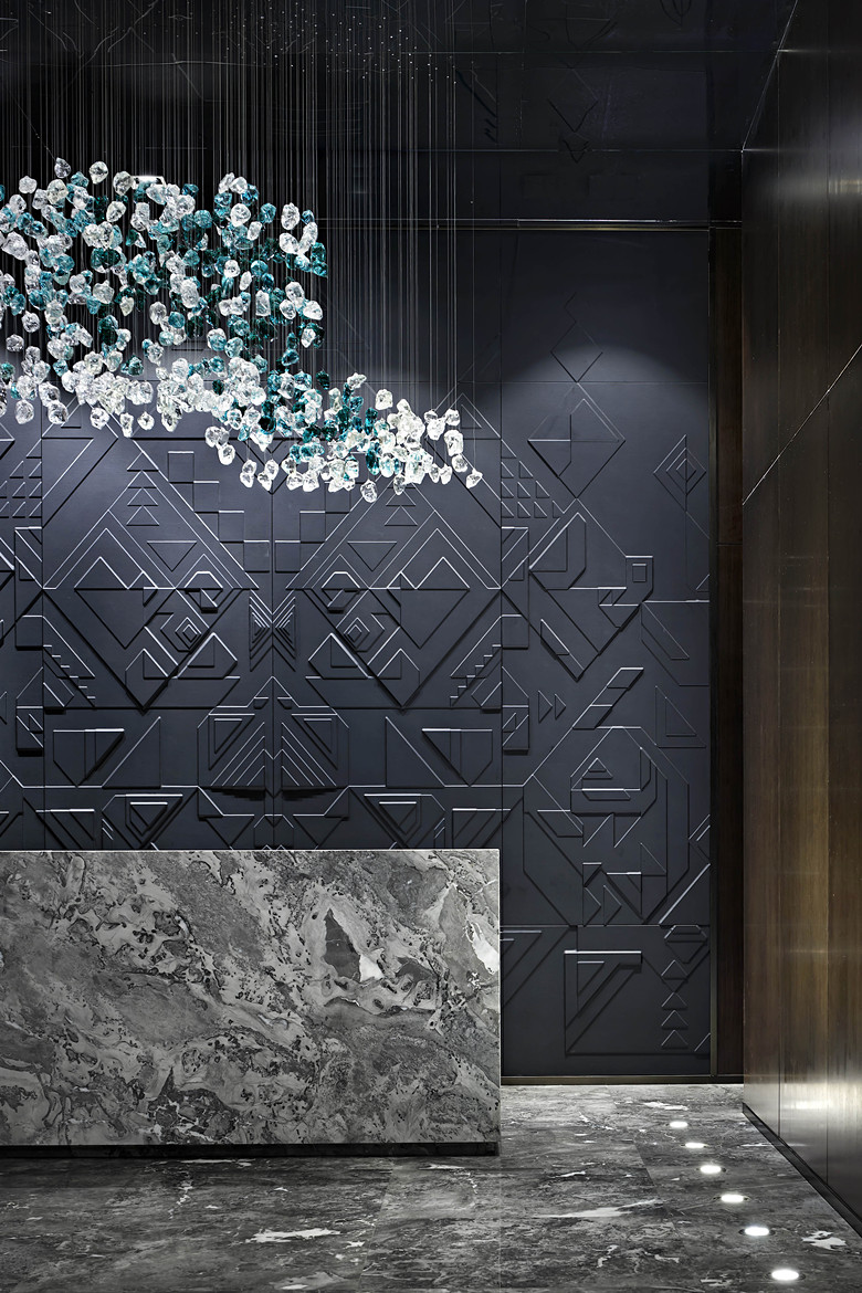设计师黄全在绿地梓湾国际康养度假区售楼中心的设计中,大胆运用光影和色彩,创造出独特的视觉效果。前厅两侧接待处以立体几何浮雕墙面渲染神秘,峻深劲利的线条勾勒出深沉内敛的机械感,在精妙的布光下显现出锐利的光痕。
