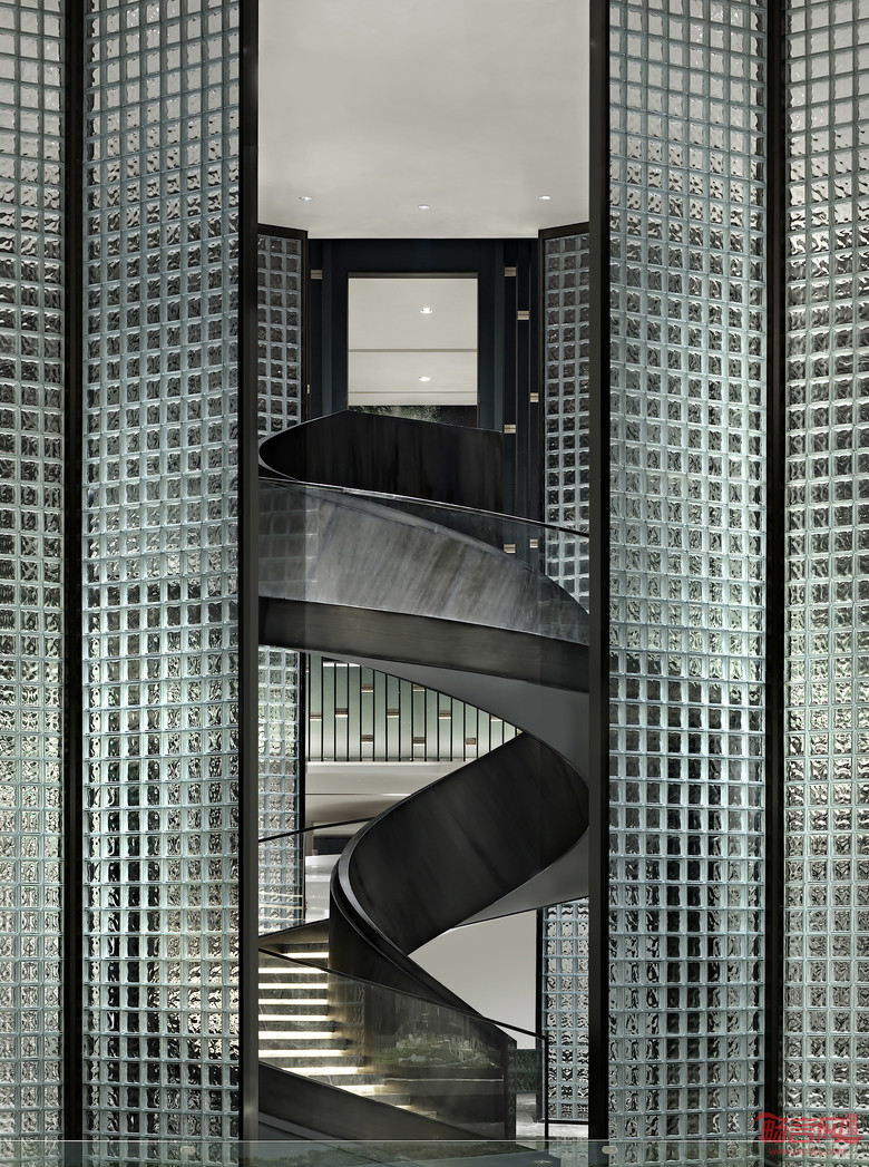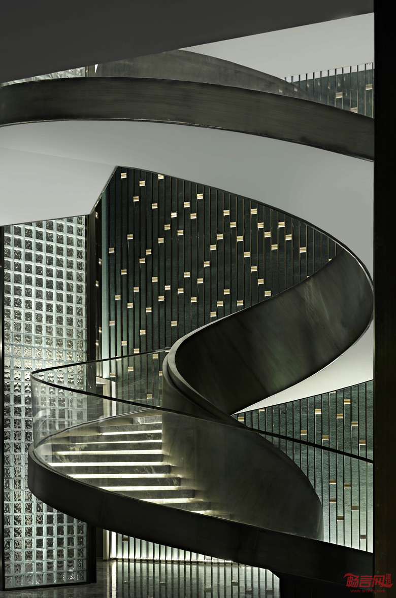 由玻璃砖块堆砌而成的四道透明屏障将楼梯环绕包围,从上方向下探视,好似窥见到一只俯冲而下的神鸟。