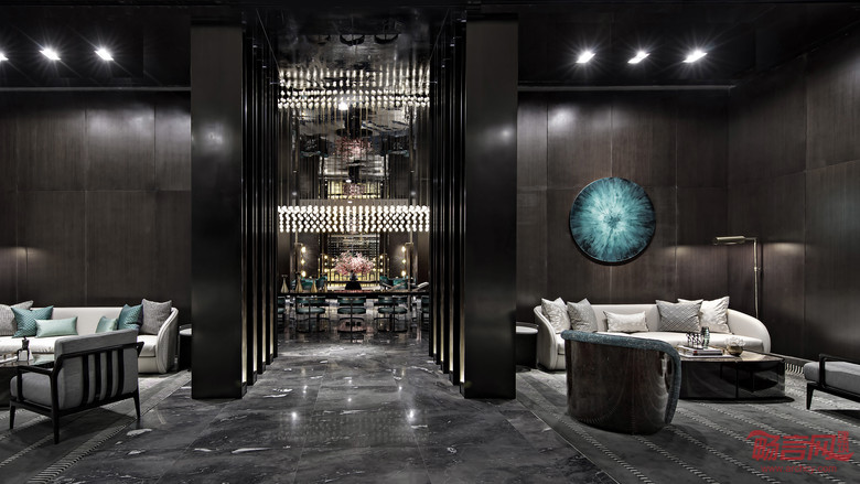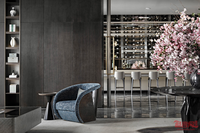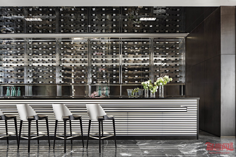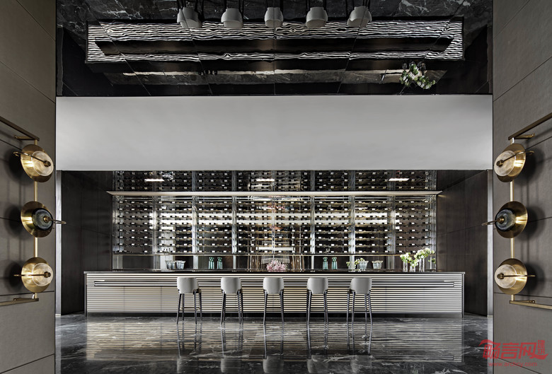 水吧台通过概括提炼的方式增强空间形式感,利用线性阵列与陈设元素的拼接传达出肃静、前卫的时代气质。吧台区在黑白锋线构成的图景中,设计师运用局部色彩关联的手法从平铺直叙中突围。