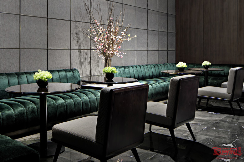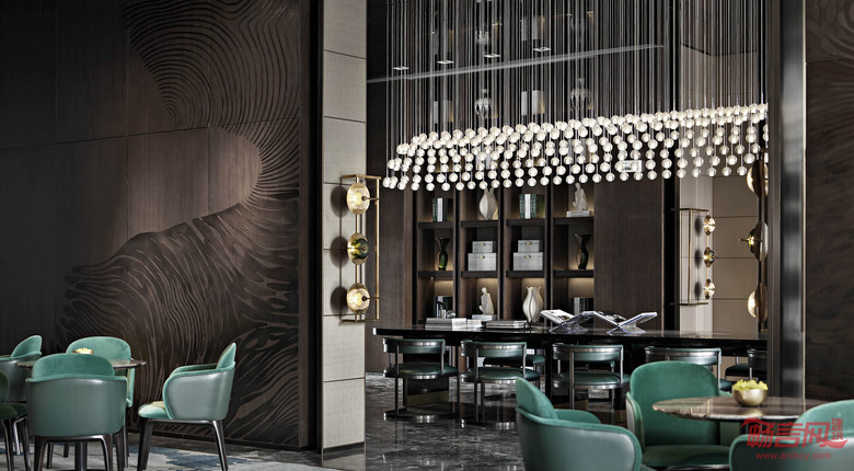 木纹雕花板以巨大的冲击力席卷着访客的想象,充满怀旧情调的墨绿与暖棕色墙体相呼应,将偌大的空间紧密衔接起来,达到混融贯通之境。细密悬垂的水晶珠帘在书吧区上方撑起一道朦胧帷幕,框定界线的同时也为空间注入浪漫与复古,仿佛将记忆带回到遥远的怀旧年代。